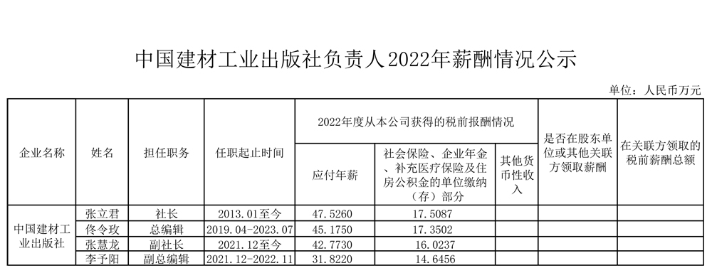 中國(guó)建材工業(yè)出版社負(fù)責(zé)人2022年薪酬情況公示